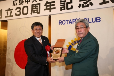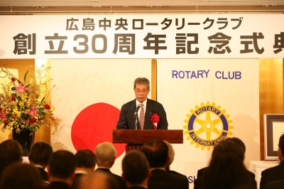 30周年記念式典が11月29日土多くの来賓、在広ロータリアン、ゲストの参加を頂き開催した。来賓を代表してRI2710地区諏訪昭登ガバナー、スポンサークラブの東南RC𠮷岡民登会長、台中西区RC呉英偉会長から暖かい祝辞を頂きました。