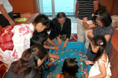 夜間例会の後は懇親会の美味しいバイキングで始まった。しばらくしてBINGOは期待通りの豪華な商品群から争奪戦が繰り広げられ、トップバッターでBINGOを当てたのは米山奨学生の黄 郁 芩さん。プレイブースでは射撃、ボールすくい、綿あめを子供達が楽しみ、8時から打ち上げ花火を楽しんだ。帰りの事は忘れて・・・・・