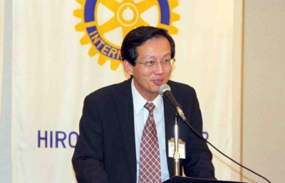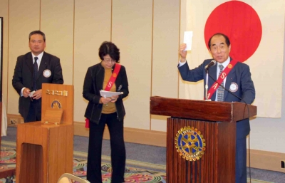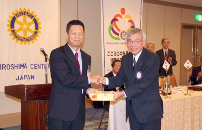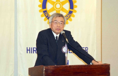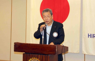 ゲスト卓話に先般北朝鮮へ原爆被曝者の支援に行かれた松村循環器・外科医院理事長松村誠氏に北朝鮮の今と、[この冬早死にしない為に]をテーマに卓話を頂いた。本日台中西区RCから観光に来日されたメンバー7名と夫人1名が例会に出席。4日間の滞在中、本日の例会夜の懇親会、歓迎会が開催される。