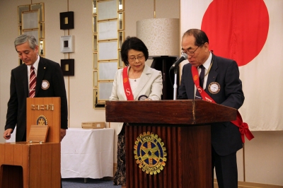 会長時間には、新会員石田照佳君の入会式が行われた。会長から四つのテスト、ロータリーバッジなどが渡され、本日より正式に当クラブの会員として早速ニコニコチケットを出宝することになった。