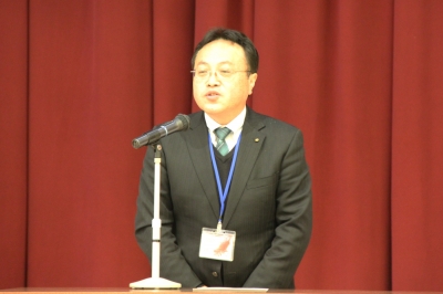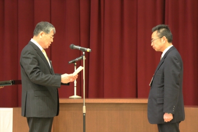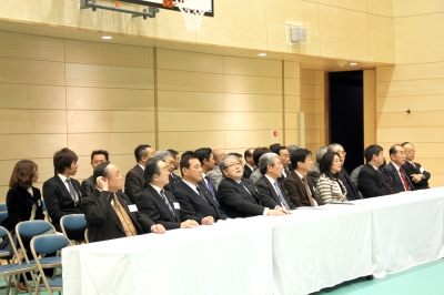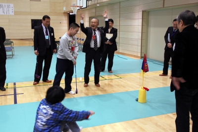広島市特別支援学校にて職場訪問例会を行った。例会終了後校内を長尾校長の案内で校内を見学し、体育館に移動。中学生の皆さんが参加して地区補助金制度によるスナックゴルフ道具の贈呈式を行った。