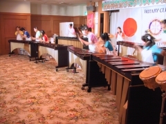 今回のアトラクションは小学生を中心にした「広島ジュニアマリンバアンサンブル」の演奏。14人のメンバーがいかにも楽しそうに、全身を使って生き生きと個性豊かに演奏する様子は聞くもの、見るものを引き込み、特に出席した会員のお子さん、お孫さんはステージ前まで出て聞き入っていました。子供さん向けの曲、クリスマスソングを演奏する子供たちが代わる代わるに紹介、そのコメントも元気一杯!予定の曲目が終わったあと、参会者から期せずして「アンコール!」の大合唱、アンサンブルのメンバーはそれに「ドレミの歌」で応えてくれました。