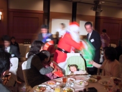 お子さんたちのお楽しみはなんといってもクリスマスプレゼント!今年のサンタさんは森本幸雄会員、一人一人に「メリークリスマス!」と声を掛け手渡していきました。最後はこれも定番になっていますサンフレグッズのお楽しみ抽選会、下田、西河両選手にお手伝い頂き、次々と抽選、ボールが当たった人には両選手のサインを入れてもらい、嬉々として持ち帰っていました。