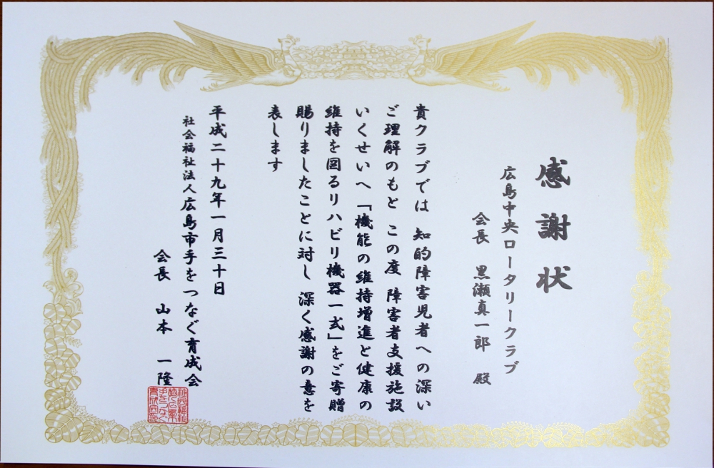 地区補助金を利用した、奉仕プロジェクトの活動は毎年着実に成果を上げているが、育成会への支援は、今年が3回目。広島市健康福祉局から、福岡部長、大上課長。育成会から山本会長他7名の方がてのご出席を頂き贈呈式を開催することができた。