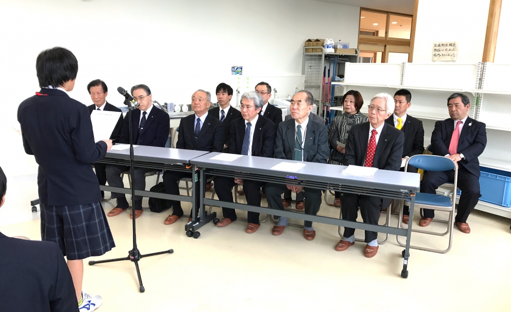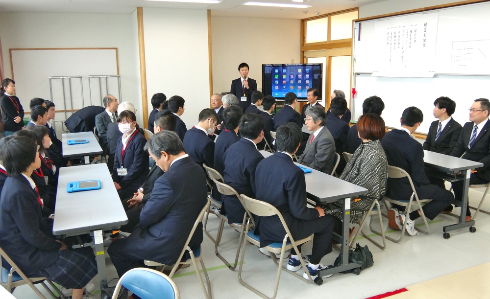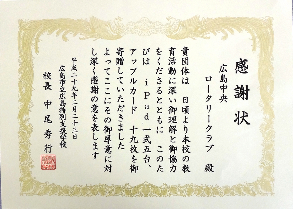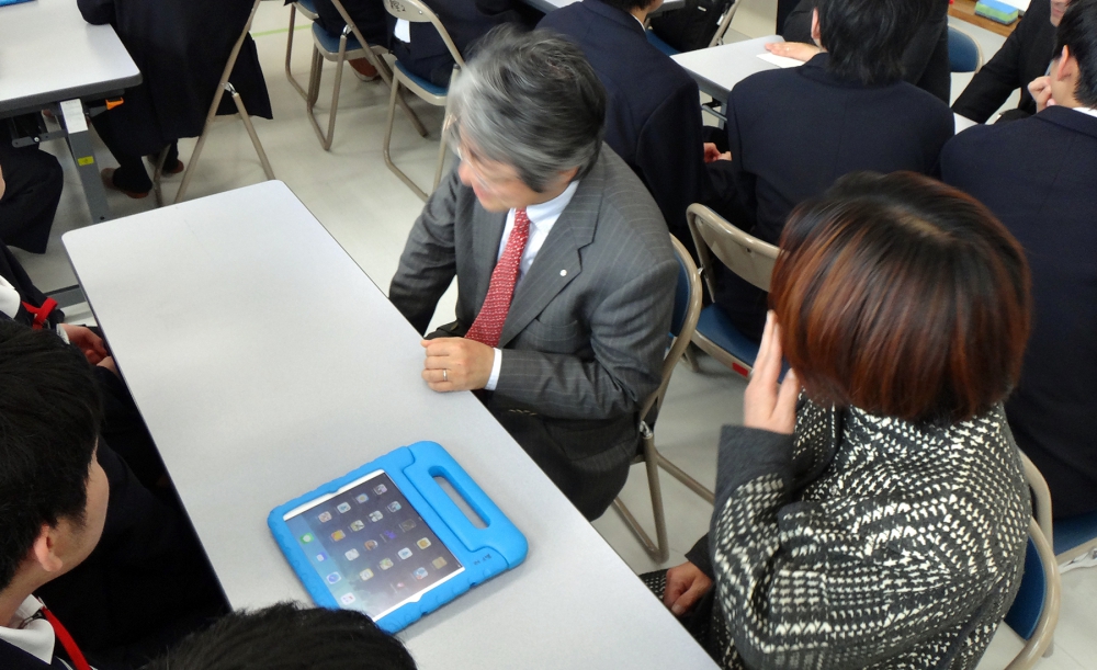 会員16名が参加して、広島特別支援学校へ i pad 5台を寄贈し、全員で i pad を使って行う授業を体験した。