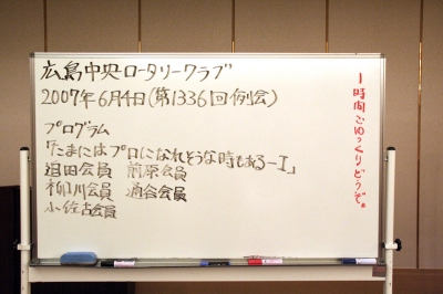 今日から6月のスケジュールへ入りました。25日は最終夜間例会、早いモノですね。本日は第一例会で出席率もグンと上ったようです。100%出席は難しいのですが、当クラブの出席率はなかなかのようです。では本日の例会を写真でご紹介しましょう。