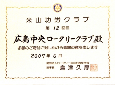 卓話時間は新会員「黒瀬真一郎」君の平和と教育一筋の人生を、ビデオを使っての卓話だった。米山厚労者表彰の村本憲康君、杉本嘉朗君。山功労クラブ(第12回)感謝状披露など、話題の多い例会となった。