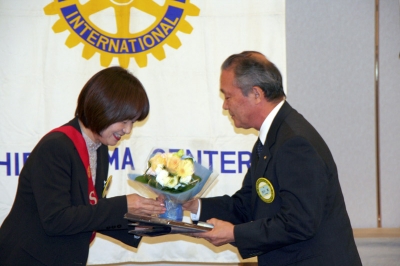 本日59人目の新会員吉川恵(きっかわめぐみ)君の入会式を行った。職業は水質検査、一男三女の6人家族。趣味はコーラスと穏やかな人柄。前回出席した例会でロータリーソングを歌ったので入会を決めたとか、そんな方をお待ちしていました。よろしくお願いいたします。