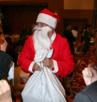 本日のゲストはもう一組、吉清理事会員率いる12名編成のパワフルなラテンバンド、NGOオールスターズ。そのバンド奏でるクリスマスソングに合わせて会場に入って来たのは! 後藤会員扮するサンタクロースから子供たちへのクリスマスプレゼント。