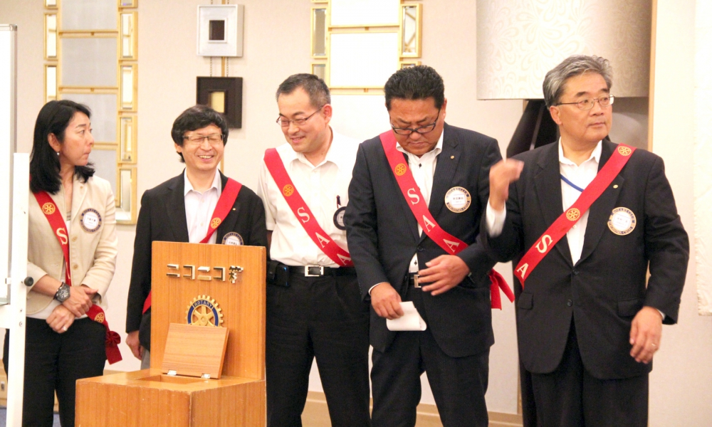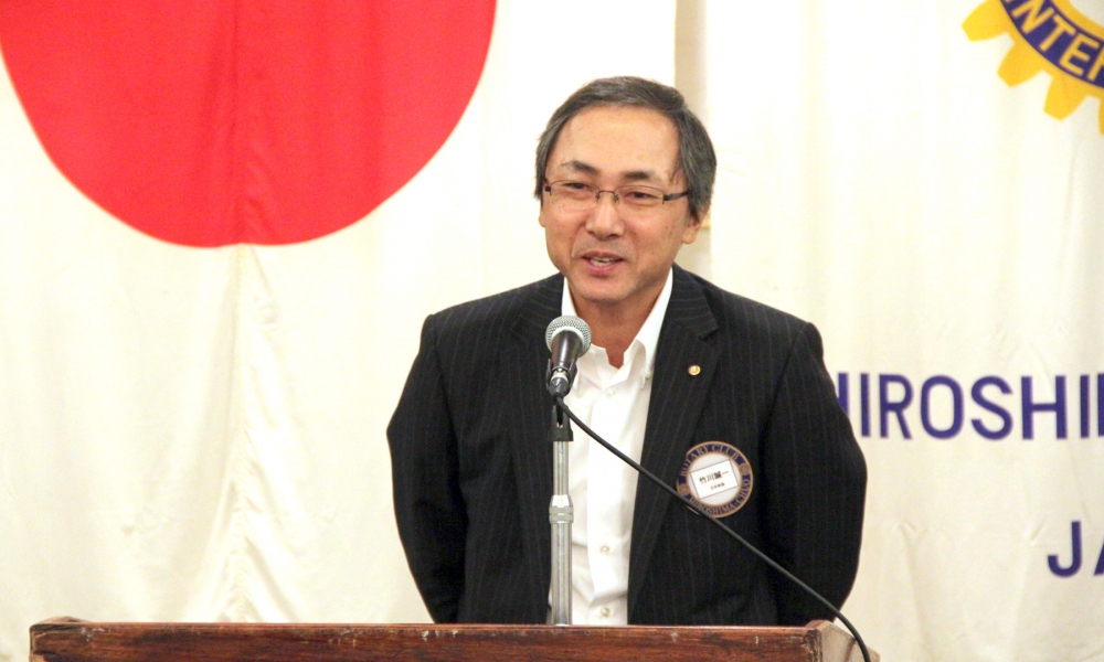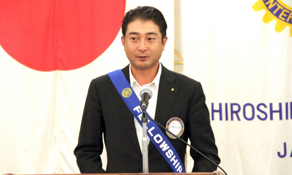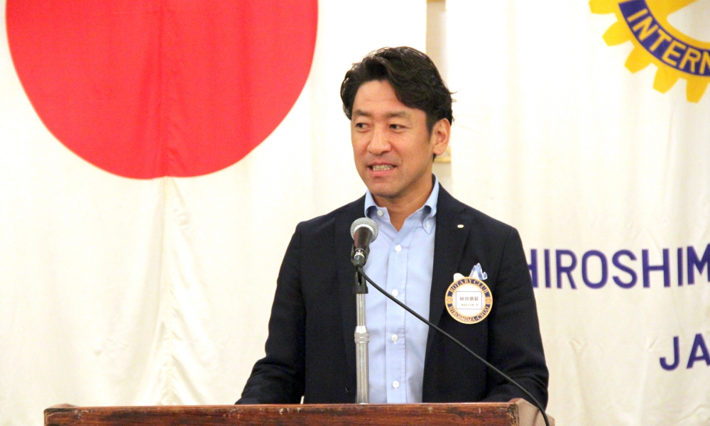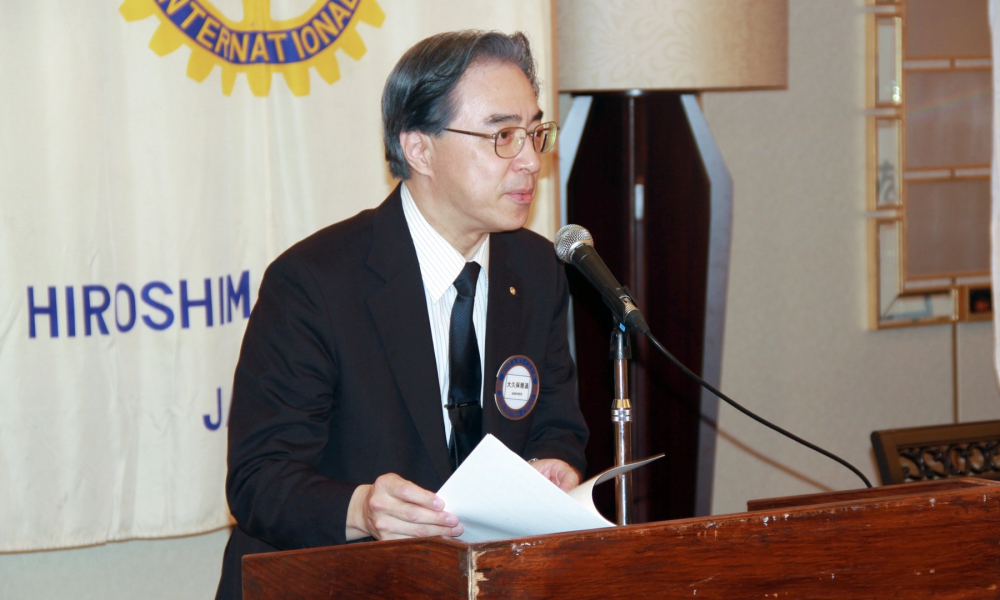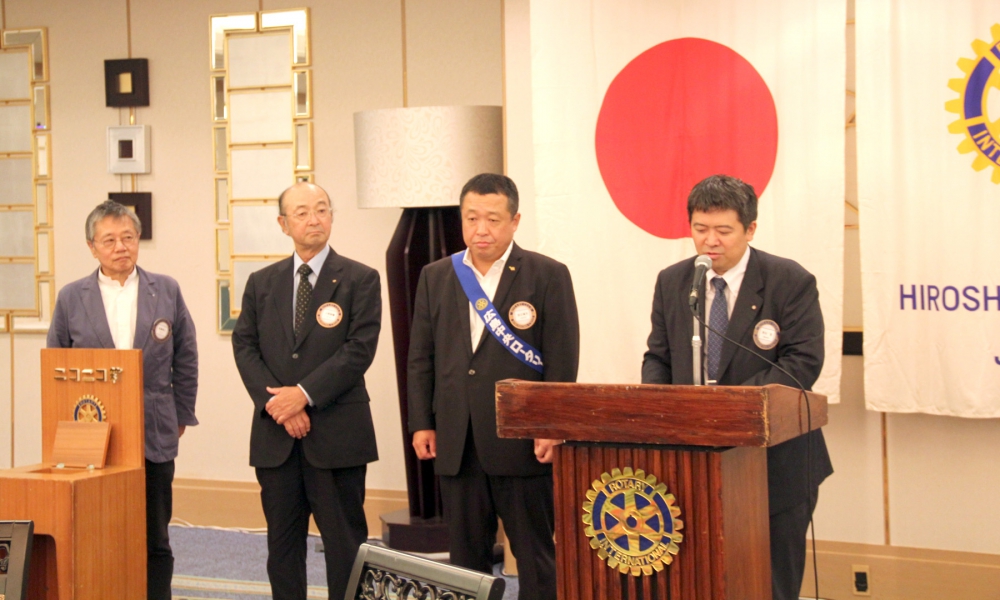 雨降って地固まる。という言葉のように今日の天気を吉兆の前触れと捉えて1年間精進していきますので宜しくお願いします。会長として初めての仕事は、前年度会長から引き継ぎました木槌での点鐘でした。点鐘は、例会開始の挨拶であるとともに社会的な立場や年齢、性別を問わずロータリアンみんな平等です。という合図だと私は思っています。終わりの点鐘は、それぞれが社会生活に戻り職業奉仕に尽くして下さい。という合図だと思っています。我がクラブは、お互いに認め合い、尊敬し合って、自己を磨き、対話を楽しむといった気風を情勢していきたいと思っています。最初の会長時間なので、皆様にここで宣誓をしたいと思います。私は日本国憲法及び法律を忠実に擁護し、国際ロータリー定款細則並びに広島中央ロータリークラブ定款細則を遵守し何ものにもとらわれず、何ものをも恐れず、何ものをも憎まず、良心のみに従い、不偏不党且つ公正忠誠に能力の及ぶ限り、実務を重んじながら、広島中央ロータリークラブ会長の職務にあたることを固くお誓い申し上げます。