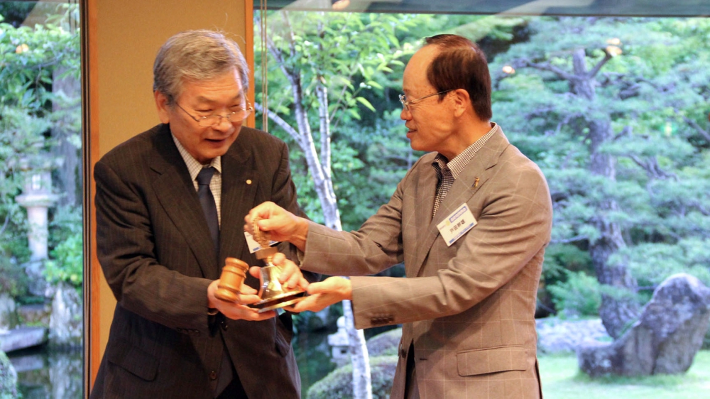写真で見る例会記録1671回最終夜間例会風景 最終夜間例会で、点鐘引継