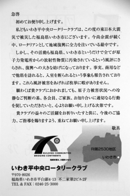願わくば貴クラブにおかれましても、原子力被害状況への冷静なご判断の基、各会員、ご家族、お知り合いに適切なる行動を促していただきたいと、心よりお願い申し上げる次第です。