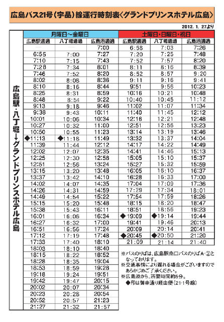 広島駅発19:41発までの便は全てホテルに着きます。(時刻表参照)