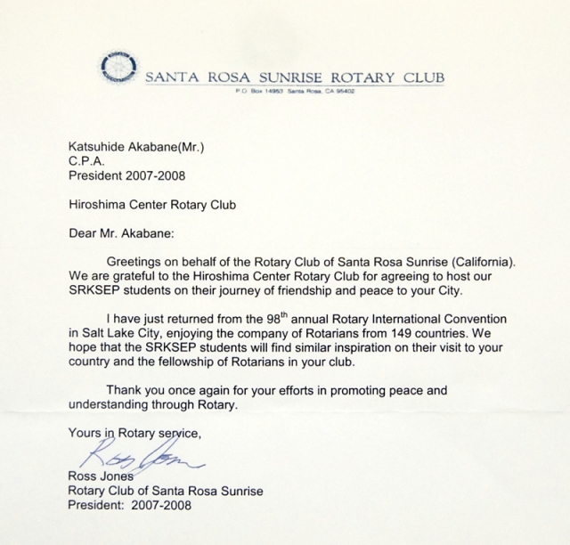 7月19日(木)~21日(土)に行われた、サンタローザ交換学生プログラムが無事に終了した。さっそくサンタローザ・サンライズRC ロス・ジョンズ会長から礼状が届いた。