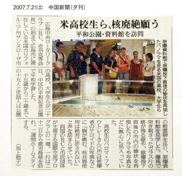 7月21日(土)の中国新聞の夕刊には、平和公園内の資料館で平和学習をする学生達の記事が掲載された。