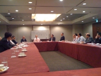 ANAの受付に行くなり、「本日は正面の席ですから居眠りはできませんね」と先制のパンチ。なんで知っているのかと言いたい気持ちを抑え、席表を見たら参加者は主催者を含め25名。会場に入ると我々の席は本当に真正面だった。