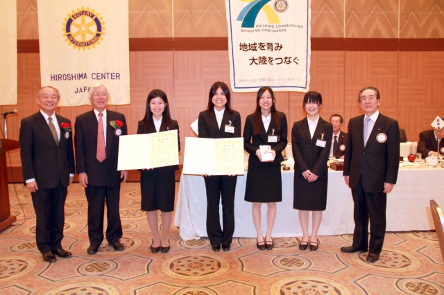 人間尊重・社会奉仕は本日の例会で過去2回の「献血・マイカー乗るまあデー」運動にご協力頂いた広島女学院大学ボランティアセンター、広島県立女子大に対して感謝状を贈りその行動に対し敬意を表した。