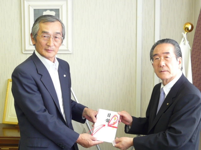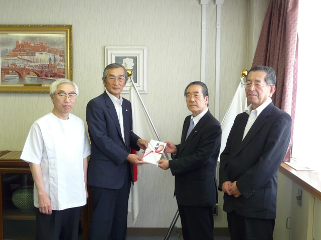 先月台中西区RCから届いた東日本大震災への義援金は、臨時理事役員会で協議の上、日本赤十字社へ届けられた。贈呈式は土肥博雄副会長の執務室である院長室で行われ、日本赤十字社 広島県支部 中川日出男事務局長 に直接手渡された。