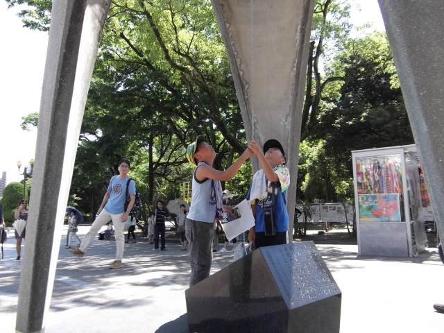 午後からは平和公園へ移動し、原爆死没者慰霊碑で祈りをした後、平和公園内の碑めぐりチームと原爆資料館見学チームに分かれて平和学習をしました。