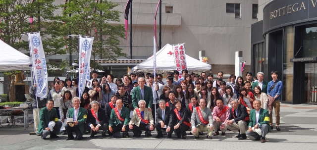当日は、雨と云う予報を聞き、心配しておりましたが、快晴に恵まれ、市内6大学の学生 さん62名と、我が会員及びその家族や関係者の53名の 総勢115名が街頭に出て、9時半から午後3時半まで、支援活動を行い、献血受付者の目標値を超えて、120名の受付を達成(献血者は86名)することが出来ました。当日は、朝から暑い中にも関わらず、学生さんたちの力強い呼び込みの声で、私達会員も、彼らの元気をもらい後に続いて、大きな声の呼びかけや、休憩時の飲み物や食事などのお世話など、行動を共にして、暑くて、心地良い汗を流しました。