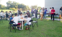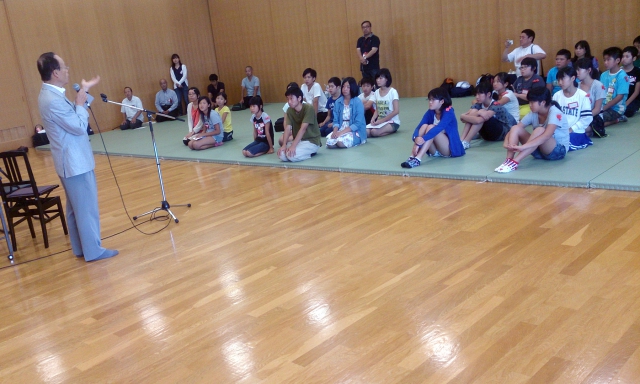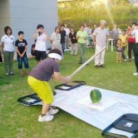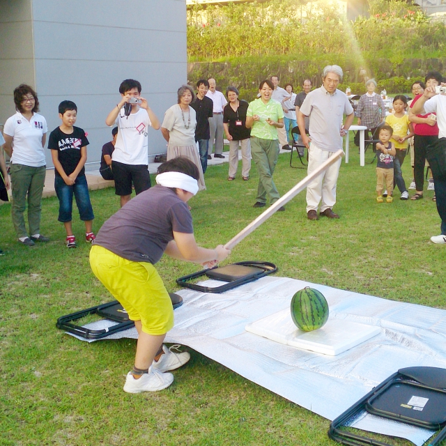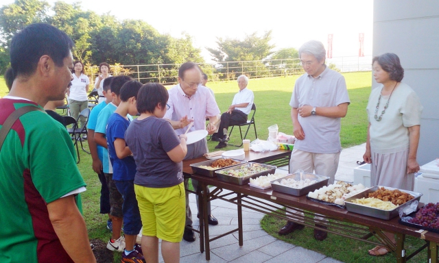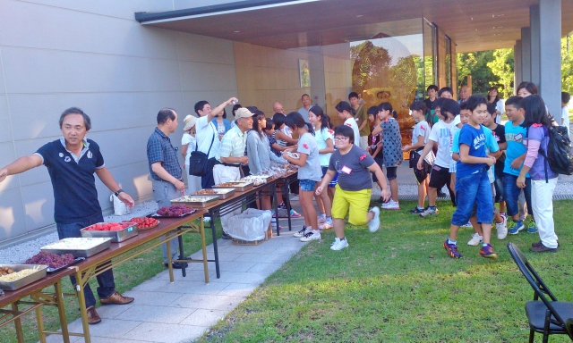 広島滞在中の市内移動のマイクロバスチャーター代、お昼のお弁当代等の支援をしたロータリー会員は8月17日(日)歓迎会に臨み、戸田会長が挨拶し歓迎の言葉を述べられました。17時30分からの歓迎食事会では会員が賄いから後片付けまで行い、14人の学童と5名の付き添いの方、お世話をされている関係者の方と交流を図り楽しい時間を過ごしました。夕食後にはスイカ割を一緒に楽しみました。今回は、会長の配慮により、学童にカープのタオルをお土産として贈呈しました。