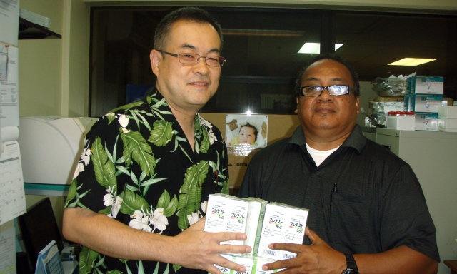 9月3日在パラオ日本大使館を表敬訪問し広島中央RCの活動概要を説明後、パラオ国立病院を訪問し検査室のマネージャーであるFrancis Termeteet氏に学校検尿用試験紙1500人分(22680円相当)を寄贈しました。パラオでは毎年全土で学校健診を施行しておりますが、非侵襲的に腎臓病や糖尿病をスクリーニングできる検尿は大変有難がれており、何度も謝辞を述べられたと同時に今後の継続支援を懇願されました。