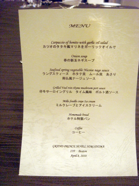 次年度幹事の橋本哲充君のお世話で会場はGプリンスホテル広島22f見晴らしの素晴らしいBostom。定刻18:30田原委員長の挨拶ではじまった。続いて4/22日西南RCで予定されている卓話の内容「エコドリーム運動」についてを詳しく説明し、来年度の活動について予算などを検討した。引きつづき懇親会では、本年度事業の反省を含め、次年度への対応などを中心にした話題で美味しい料理とワインを楽しみながら和やかな時間をすごした。長期プロジェクトは、今年を含め3年委員会として活動を続けることとなる。