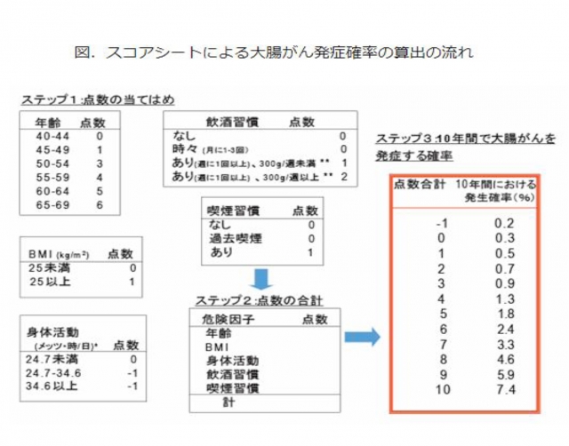 多目的コホート(JPHC)研究40歳から69歳までの個々の男性が今後10年間に大腸癌を発症する確率を推定する予測モデルを開発した。