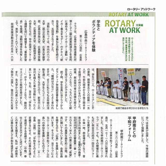 9月第一例会で配布された「ロータリーの友」9月号に、中央ロータリーの奉仕活動「学生とボランティア体験」の記事がトップで掲載されました。当誌に記事を投稿したのは今回が初めてで、9月の新世代のための月間に相応しい記事として紹介された訳です。