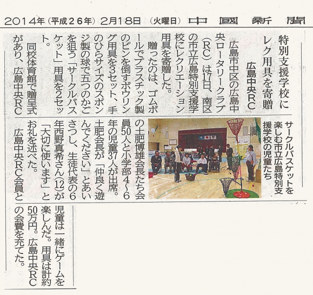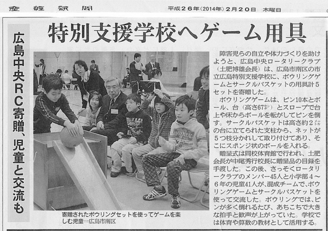 2月17日(月)の例会は会場を変更し特別支援学校訪問した。今年で3回目になる支援活動では、生徒のみなさんが気軽にスポーツを楽しめる、ボーリング、バスケットのレクリエーション用具を5組寄贈し、一緒にゲームを楽しんだ後、高等学部の生徒の皆さんからコーヒーとクッキーで接待を受け、名刺交換などで懇談した。2月18日の中国新聞に記事が掲載されましたのでお知らせします。