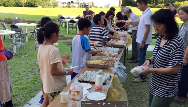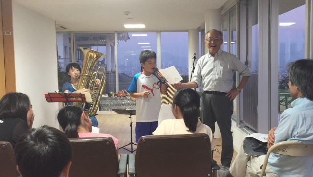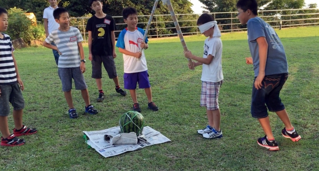 到着後歓迎会が開催された。会員7人が参加し、宿泊場所の太光寺の庭で会員が、食事を学童やボランティアの方々へふるまった。食事の終わりにはスイカ割で盛り上がった。その後、地元の音楽家の学生による音楽の夕べが行われた。