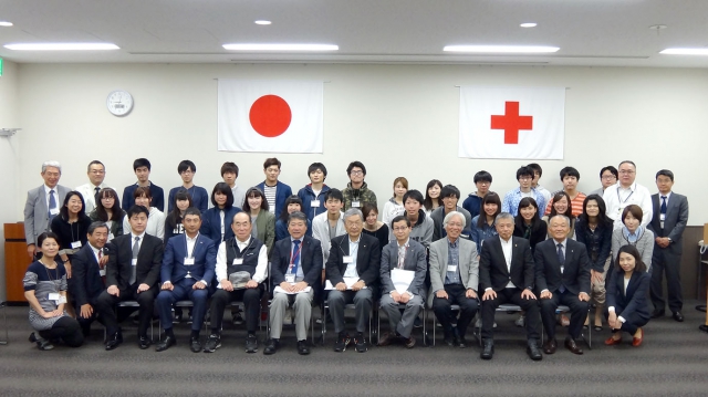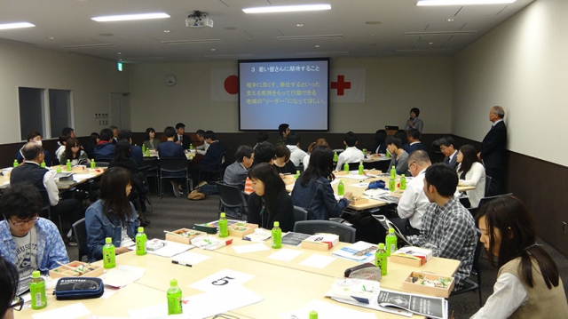 皆さまのテーブルに「マイカー乗るまぁデーPR促進」と「事前勉強会の冊子」がありますが、これを当日出席された7大学の学生33名、及びロータリアン、日赤関係者等で総勢53名に配布して勉強会を実施しました。