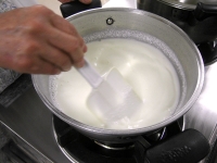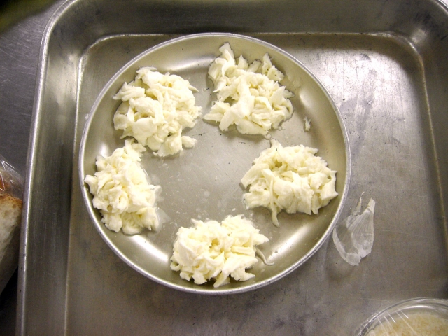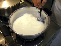 まず、1リットルのチーズと絞りたてレモンジュース、塩小さじ1/2の材料で約10分間火にかけフレッシュなリコッタチーズを作るところから・・・