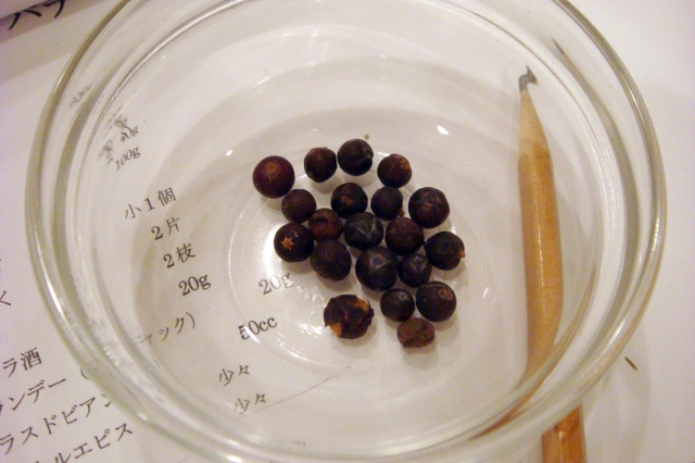 パテドカンパーニュに使う「ねずの実」黒胡椒の姿をして、実は甘酸っぱい薬味です。松の実に似た香りで少々苦味があり、臭みのある鹿や野鳥の料理に使います。又、洋酒のジンの香り付けに使うスパイスです。