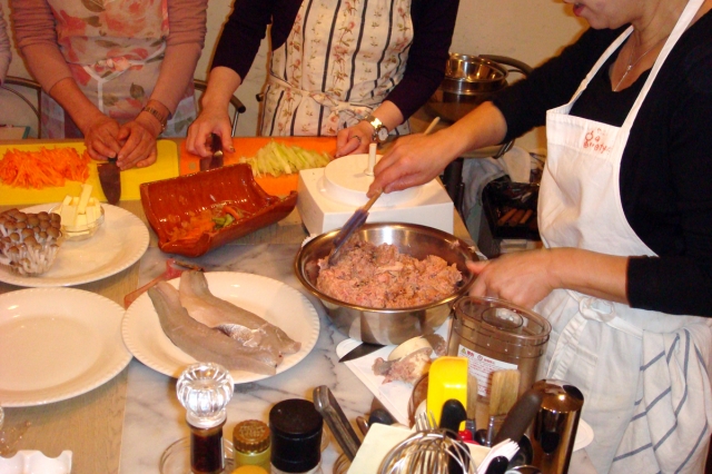 本日の食材と、調理手順を丁寧に説明をうけ、早速調理の開始。大まかなところは講師がキッチリ手本を、細かい作業は全員で手分けをします。
