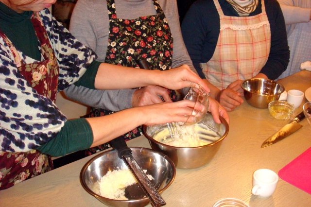 本来、お菓子作りが得意な講師は、分かりやすくパイ生地の作り方や、ケーキ生地の作り方を指導。生地の弾き方や拘りの手順を分かりやすく指導。