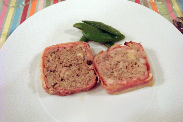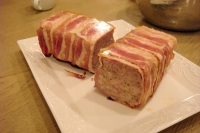 焼き型にベーコンを少しずつ重ねながら引き詰め、詰め込んだらベーコンで包み込みます。オーブン160度で30~40分余熱で15分焼きます。