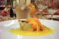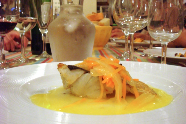 グリルされたスズキの上に、シンプルな塩胡椒だけで味付けされた野菜をのせ、野菜のスープで頂きます。実は昨日鯛を頂きさっそく調理にチャレンジ。なかなかの評判でした。スープを残すのをお忘れ無く・・・・