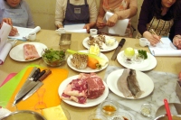 盛り上がったところに水を差すようですが、我に帰って頂き調理を開始。講師の山本先生も仕事モードに切り替えていたたき、まず本日のメニューの紹介から・・・