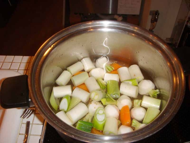 ネギの切り方、白ネギと西洋ネギの違い、本日の特別な材料下松の手作りソーセージを最後に入れ5分加熱。