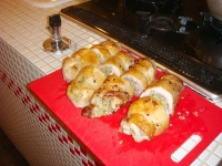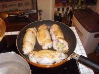 鶏のモモ肉を叩いて延ばし、パセリ、ディル、パン粉、アーモンドプードル、玉ねぎ、ニンニクを混ぜ合わせ、巻き込みます。たこ糸手で縛りフライパンでこんがりとソテー。1/2にカットし、大きめにカットした野菜とオーブンへ。180度で約45分。