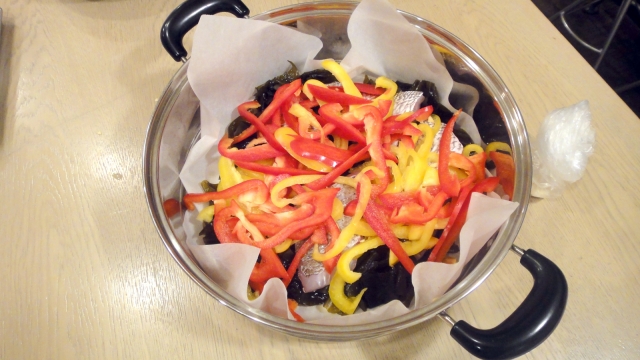 蒸し器の底にクッキングペーパーを敷き、ワカメ、桜鯛、パプリカの順でセット、20分くらい蒸す。