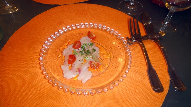 桜鯛の薄切りを並べ、フルーツビネガーと、上級のオリーブオイルに塩コショウ、プチトマトを添えて。