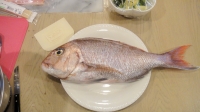 桜鯛は、会員の手でさばかれ、薄切りでカルパッチョと、切り身は蒸し料理に。