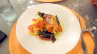 蒸したワカメ、鯛、パプリカを盛り、レモンソースで・・