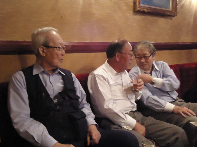 今回の写真ですが、一点めは親しそうに会話される谷平会員と神保会員、それを横から眺めている浜田会員です。私の印象ですが、谷平会員は毎回歌唱力を上げておられるようです。