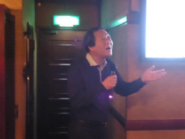 二点めは、音楽同好会第一のパフォーマー通谷会員の熱唱風景です。歌は「Hi-Hi-Hi」(あおい輝彦の歌です)で、歌もさることながら、踊りに喝采を浴びておられました。