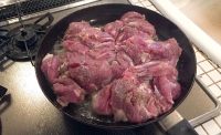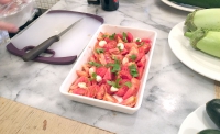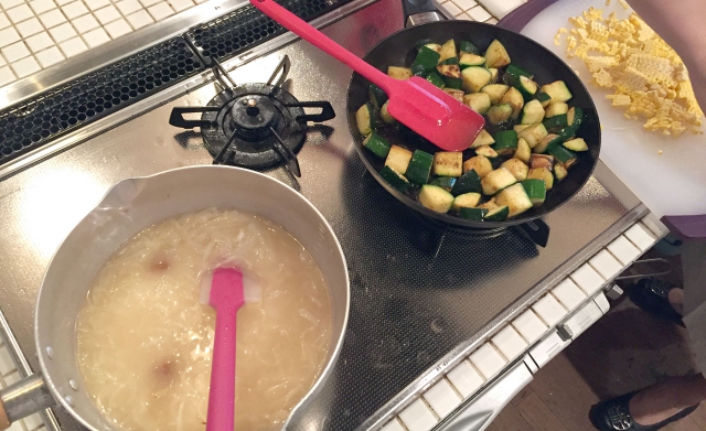 ズッキーニは皮をむき、2cm角に切り、オリーブオイルでソテー。塩・胡椒して蒸し焼きに。