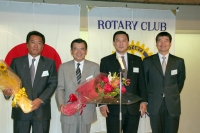新年度会長・幹事から、役目を終えた緒方会長・村本幹事へ、労いの気持ちがあるかどうかは解らないが、花束が贈られた。女性会員から贈られるのかとカメラを準備していると、赤羽会長・古澤幹事が花束を持っている。「へー」と思って見ていると、こんなショットになったのです。