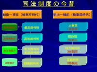 ○「弁護士」の名称は明治26年(1893年)からで,それまでは「代言人」。戦前の弁護士は,試験制度や修習制度が裁判官・検察官とは別で,裁判官・検察官よりも格下に見られ,司法省(法務省の前身)の監督下に置かれていた。昭和24年(1949年)に日本弁護士連合会が結成されて国の監督下を離れ,同年施行の司法試験制度の下,弁護士も裁判官・検察官と同一の試験と修習(司法修習生)を経ている。